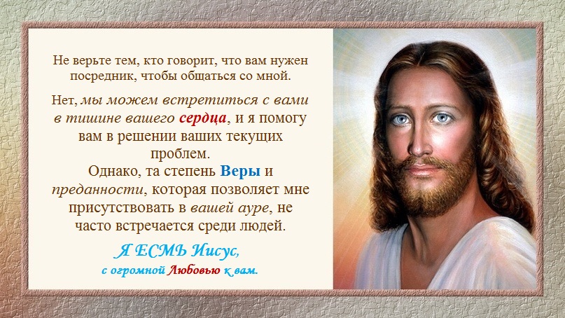 Я открыт для общения, но вы сами должны приложить усилия, чтобы подойти ко мне, возвысить ваши вибрации до того уровня, когда наше общение может состояться. И каждый из вас хорошо знает те недостатки, которые мешают ему подойти ко мне, однако вы не торопитесь расстаться с вашими недостатками и проблемами.