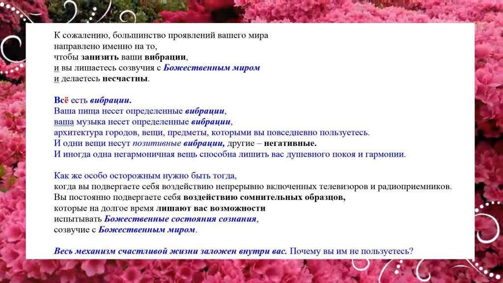 Зачастую мы окружаем себя вещами, занижающими наши вибрации. Но нам надо стараться хранить созвучие с Высшим Миром. И в минуты, когда становится трудно, мы можем попытаться найти в себе силы и войти в мысленное соприкосновение с Богородицей.