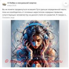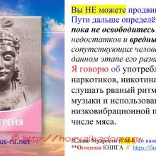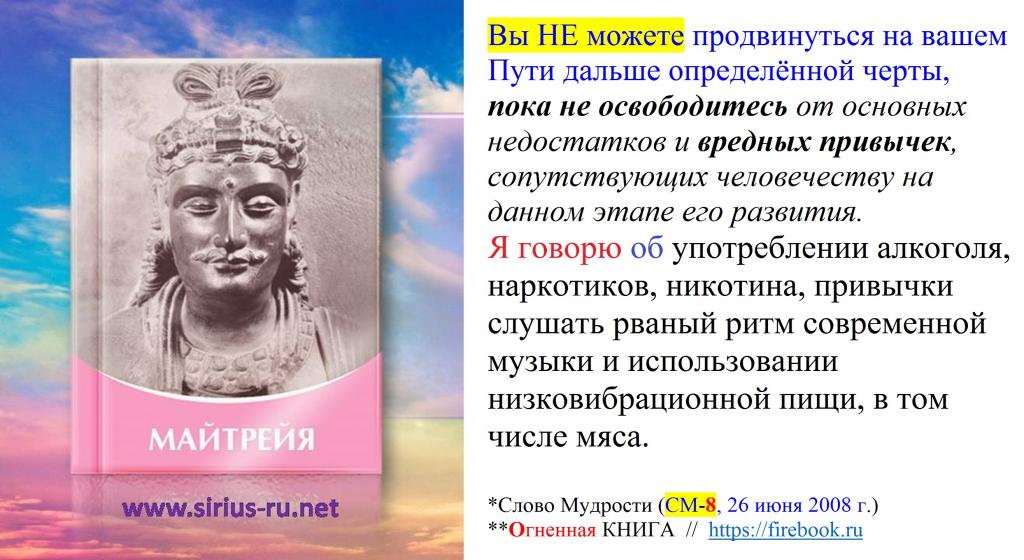 Я говорю об употреблении алкоголя, наркотиков, никотина, привычки слушать рваный ритм современной музыки и использовании низковибрационной пищи, в том числе мяса.