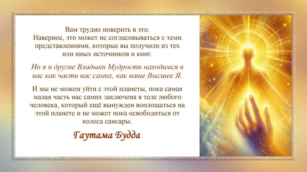 Но я и другие Владыки Мудрости находимся в вас как части вас самих, как ваше Высшее Я.