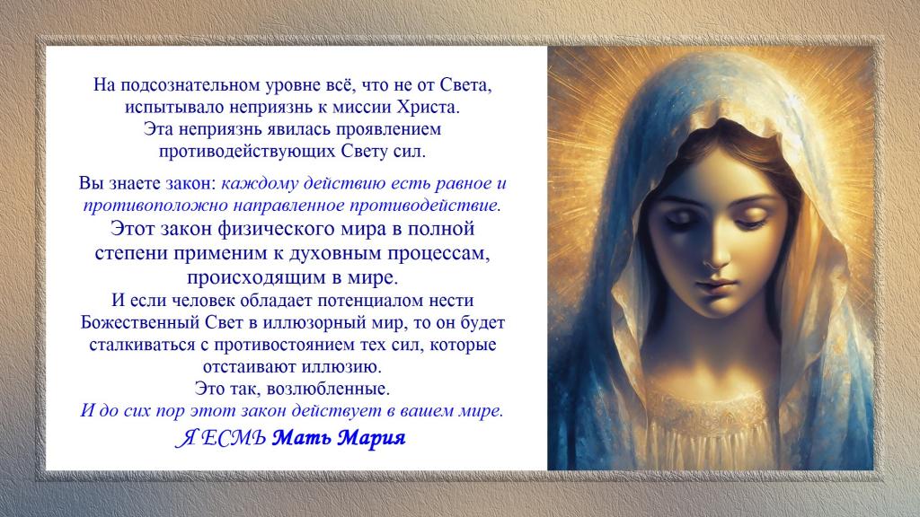 Вы знаете закон: каждому действию есть равное и противоположно направленное противодействие. Этот закон физического мира в полной степени применим к духовным процессам, происходящим в мире. И если человек обладает потенциалом нести Божественный Свет в иллюзорный мир, то он будет сталкиваться с противостоянием тех сил, которые отстаивают иллюзию.